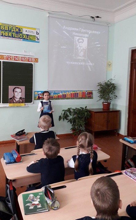 12 апреля 2019 года в рамках празднования Дня космонавтики с целью ознакомления с историей космонавтики, с лётчиком-космонавтом А. Г. Николаевым в 1а классе МБОУ «СОШ №1» прошел классный час «А.Г.Николаев – третий космонавт в мире». В начале мероприятия классный руководитель рассказала о жизни летчика, выделила самые значимые моменты его биографии. Рассказ сопровождался видеофильмом и презентацией о Андрияне Григорьевиче Николаеве. Также юные читатели познакомились с книгами о знаменитом земляке. На классном часе ребята узнали, что Андриян Николаев - личность, легендарная не только в Чувашии, но и во всём мире: один из первых космонавтов страны, участник первого группового полёта. Первый, кто отстегнул привязные ремни кресла космонавта и испытал на себе эффект космической невесомости. Первый, кто участвовал в самом продолжительном на то время полёте. Человек, жизнь и труд которого являются примером, а для нас ещё и национальной гордостью.