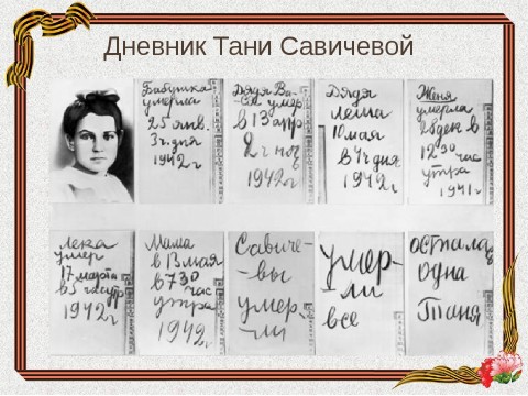 Ребята узнали, как дети и взрослые – изо дня в день переносили блокаду, сохраняя человеческое достоинство. Эта тема взволновала ребят. Одним из самых трогательных моментов мероприятия стал просмотр дневника ленинградской школьницы Тани Савичевой. Беседа пробудила в детях чувство сострадания и гордости за стойкость своего народа в период блокады Ленинграда и на протяжении всей Великой Отечественной войны.