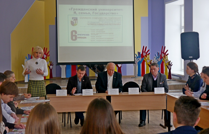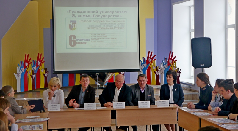 В рамках форума активных граждан «Шумерля: содружество поколений» на базе МБОУ «СОШ №1» города Шумерля 16 марта 2018 года работала площадка «Гражданский университет: Я, семья, Государство». Мероприятие прошло в формате круглого стола, на котором актуальные проблемы современной России обсуждали учащиеся старших классов школ города. В качестве экспертов выступили Садырга В. М., общественный деятель нашего города, который не одно десятилетие возглавлял администрацию города Шумерли; депутаты городского собрания Пронин Л.Н., Полякова Т. В., Дроздова Е.А.; Председатель профсоюза работников образования Ефремов А.М.; учителя истории и обществознания Бурбукина Л.К., Алексеева Т.А.